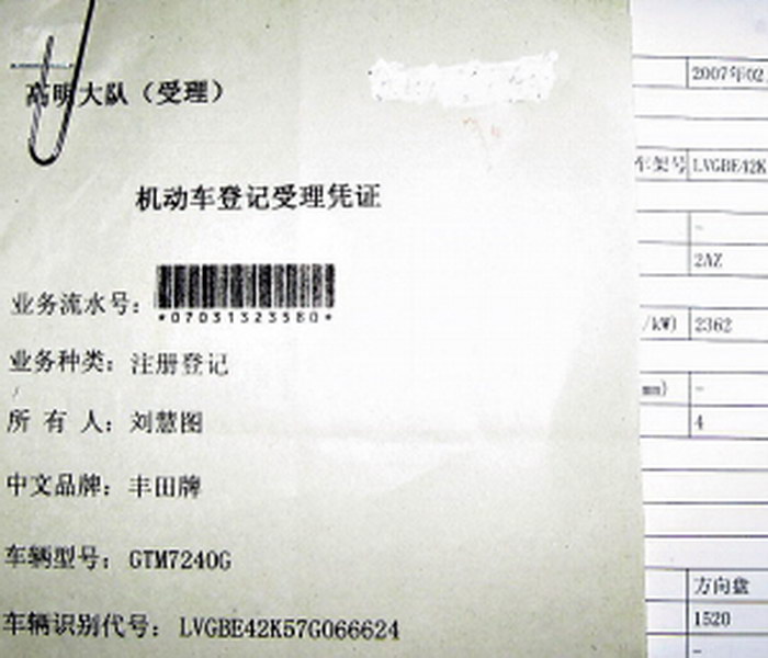机动车登记受理凭证。新车携带机动车销售统一发票。